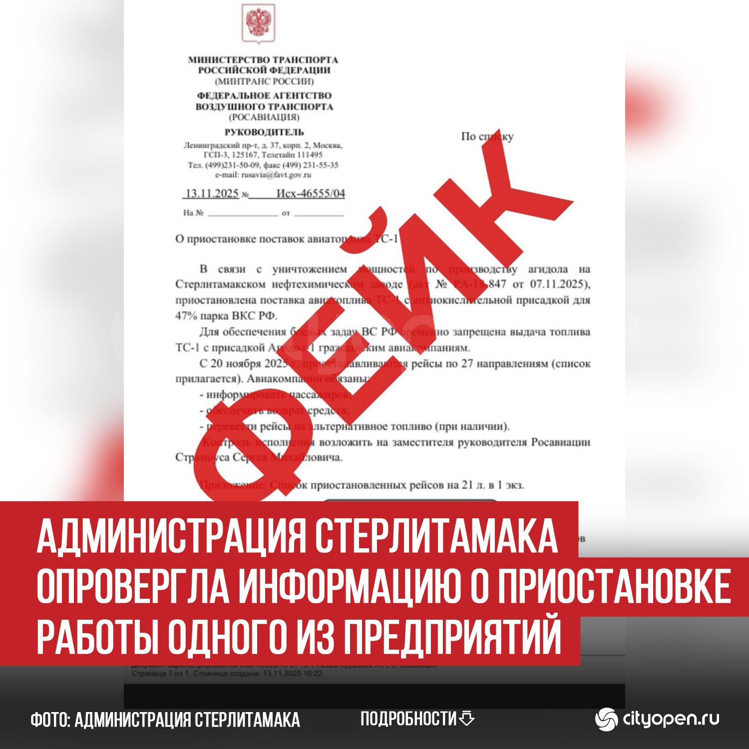 В соцсетях появился очередной фейковый документ, в котором говорится о приостановке работы одного из предприятий. В администрации Стерлитамака опровергли эту информацию, отметив, что она недостоверна, а предприятие продолжает работу в штатном режиме.