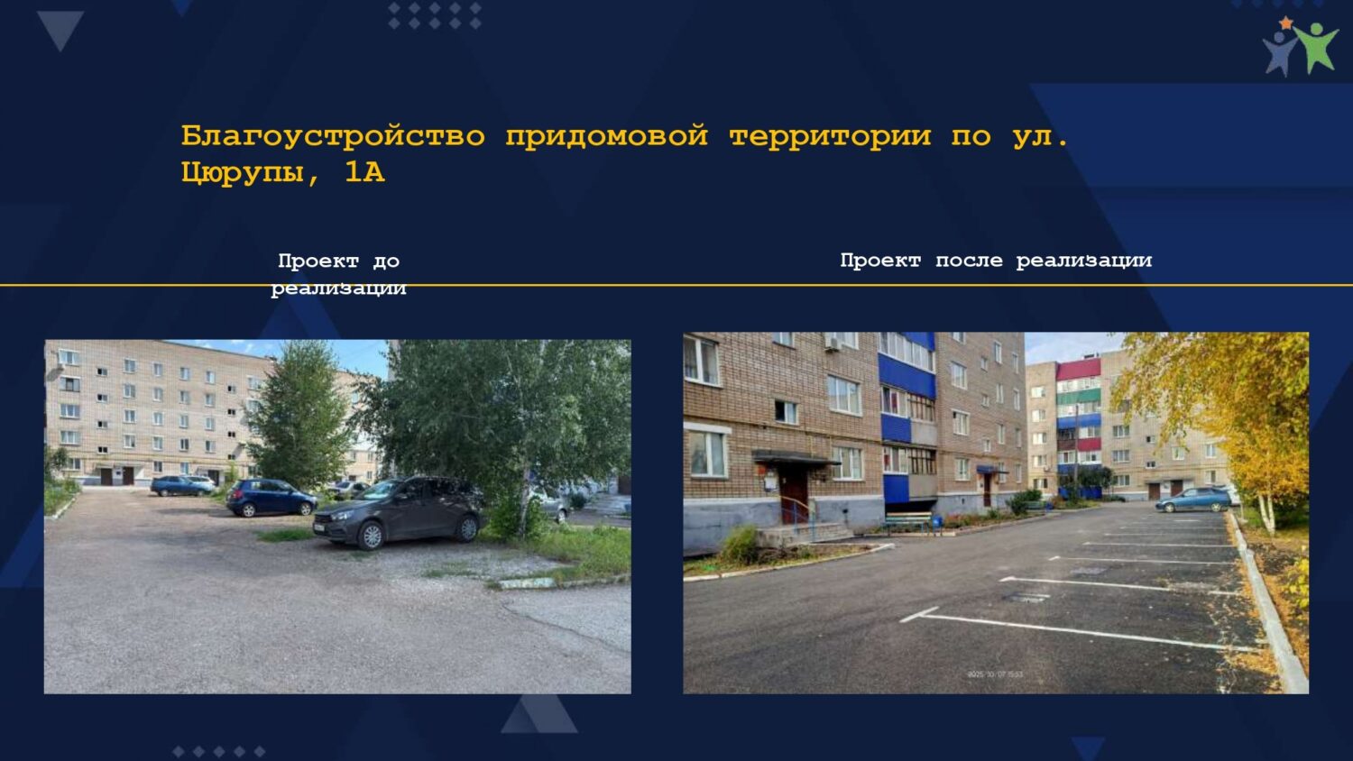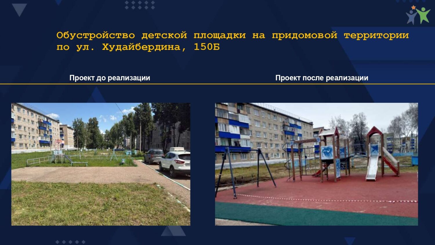 Также было благоустроено 8 придомовых территорий. Это участки по ул. Дружбы,31, пр. Октября, 85, ул. Элеваторной, 66, ул. Суворова, 10, ул. Цюрупы, 1А и 1Б, ул. Фурманова, 10Г и по ул. Якутова, 9В. По ул. Худайбердина, 150Б появилась новая детская площадка с резиновым покрытием.