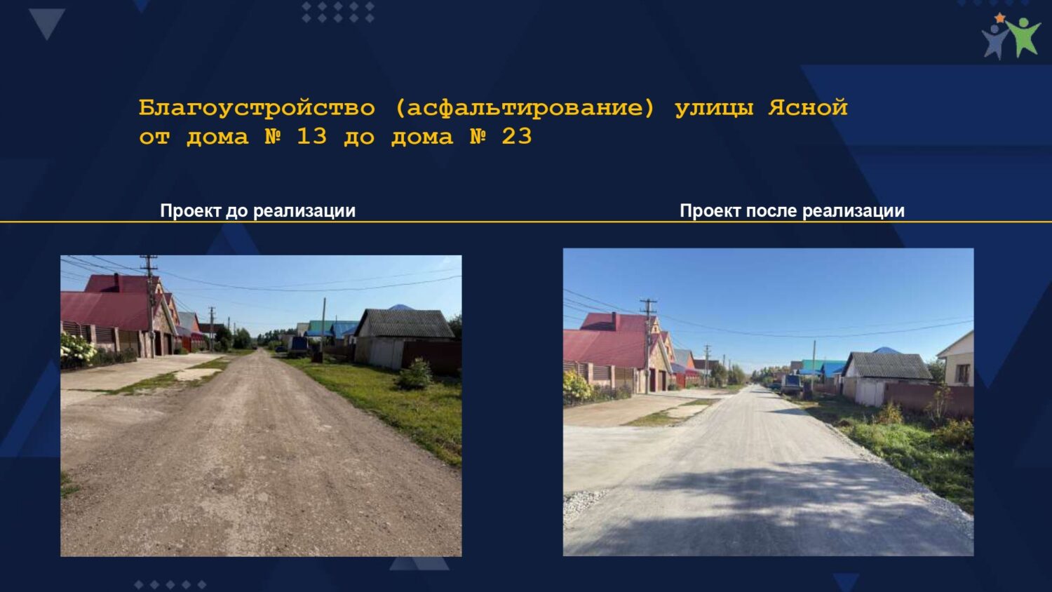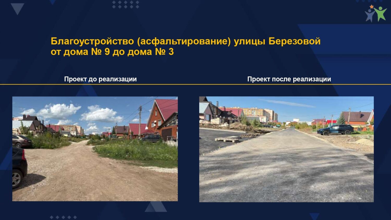 Отмечено, что на сегодня реализованы все 32 проекта. Проведено асфальтирование 15 участков дорог общей протяженностью почти 2000 метров по ул. Березовой, ул. Пригородной, ул. Ясной, ул. Мирной, ул. С.Лазо, ул. Первомайской, ул. Машиностроителей и ул. Арсланова.