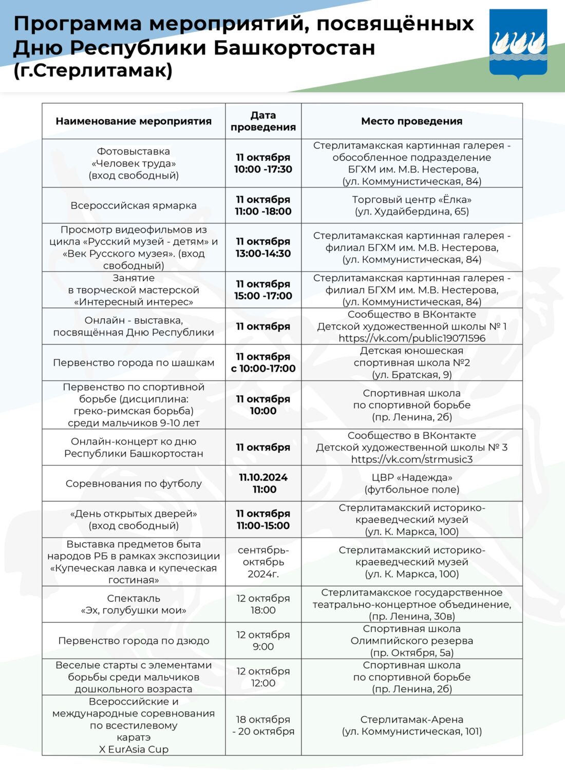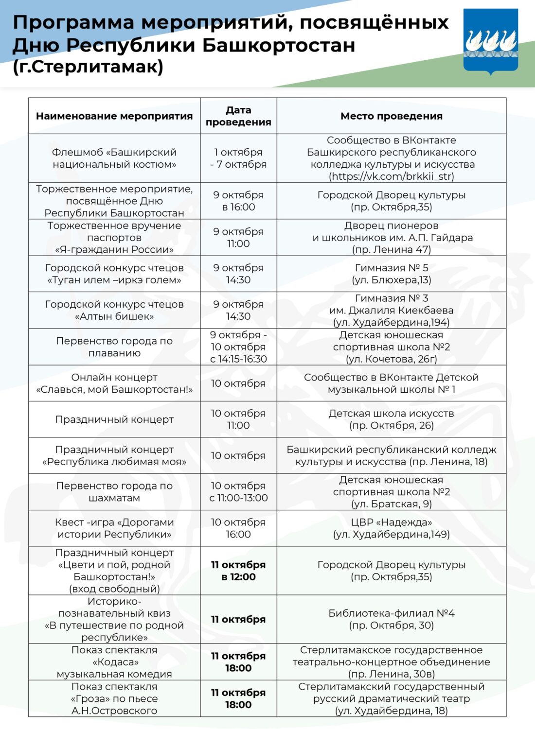 В Стерлитамаке с 1 до 18 октября в честь праздника пройдет несколько мероприятий. В программе запланированы онлайн-выставка, концерты, фотовыставка, спортивные мероприятия, показ спектаклей, флешмоб и другое. Подробнее – в программе, опубликованной администрацией города.