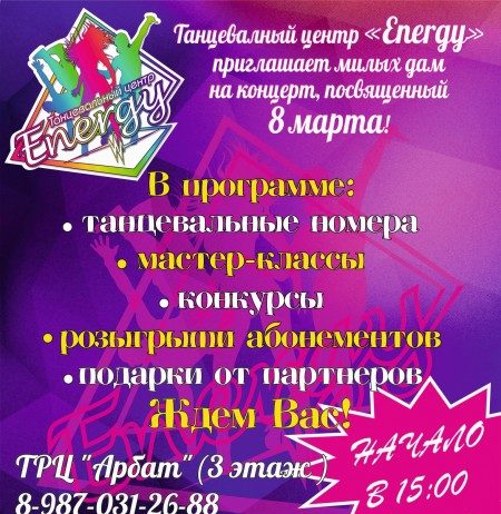 Танцевальный центр “Energy” приглашает милых дам на концерт, посвященный 8 марта