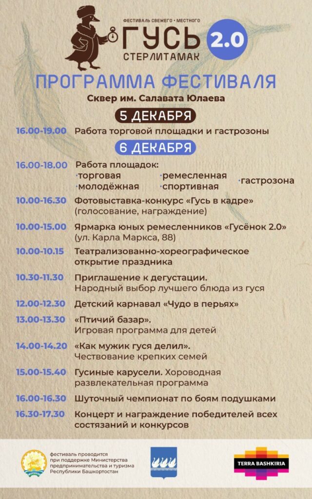 В Стерлитамаке на территории сквера им. Салавата Юлаева 5 и 6 декабря, как уже сообщалось ранее, пройдет фестиваль «Гусь 2.0». Глава администрации города Эмиль Шаймарданов поделился подробной программой мероприятия. Пятого декабря