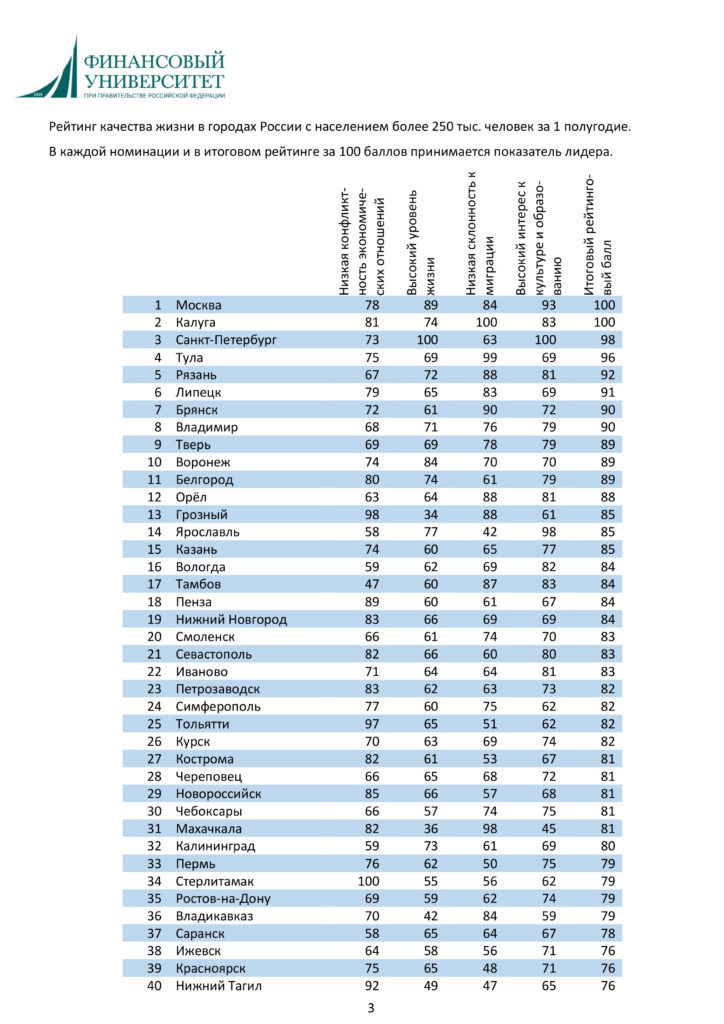 Финансовый университет при Правительстве РФ провел исследование по городам России с населением более 250 тысяч человек по итогам 1 полугодия. Оценивались конфликтность экономических отношений – готовность жителей города жаловаться и судиться, включая суды по поводу кредитов и страховых полисов, потребительская активность, склонность к миграции в поисках лучшей жизни, а также интерес горожан к культуре и образованию.
