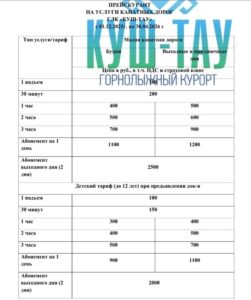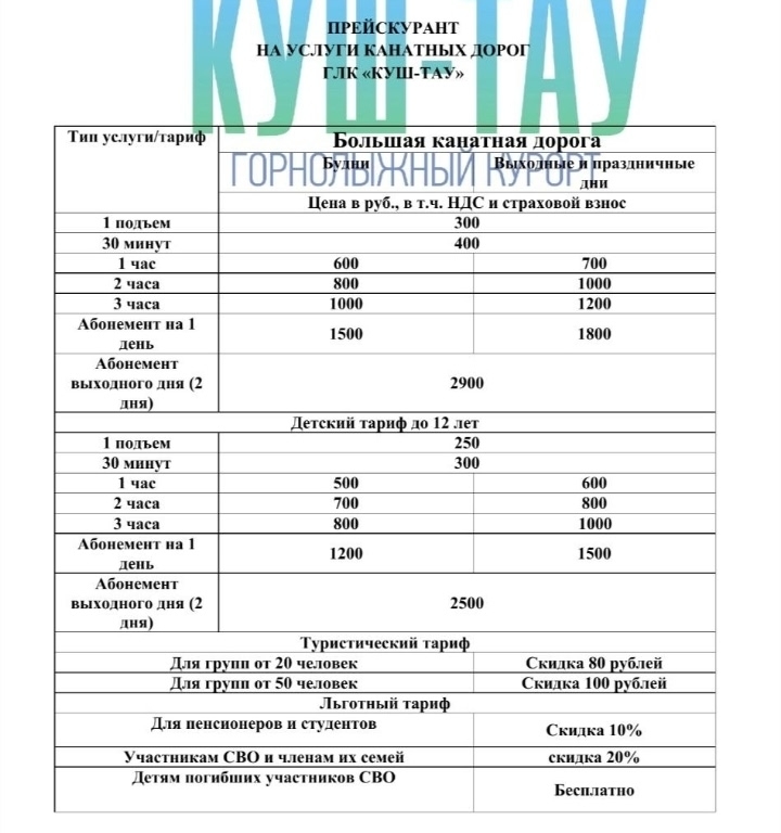 По сообщению ГЛЦ «Куштау», один подъем на малой канатной дороге будет стоить 100 рублей, 30 минут – 200 рублей. Один час в будни обойдется в 400 рублей, на выходных и праздниках – 500 рублей. Для детей 1 подъем будет стоить 100 рублей, 30 минут – 150 рублей, час в будни – 300 рублей, на выходных и в праздничные дни – 400 рублей.