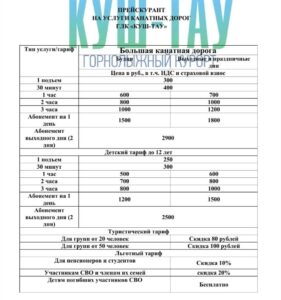 На большой канатной дороге 1 подъем стоит 300 рублей, 30 минут – 400 рублей, час – 600 рублей в будни и 700 рублей в выходные и праздники. Для детей (до 12 лет) один подъем обойдется в 250 рублей, 30 минут – в 300 рублей. Час будет стоить 500 рублей в будни, а на выходных и праздниках – 600 рублей.