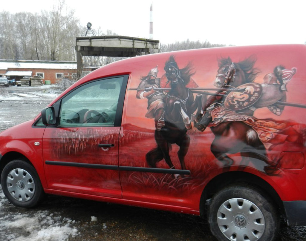 – Сначала приходилось совмещать работу на заводе и хобби. Тренировался чаще всего на рисовании картин. Примерно через год ко мне обратился знакомый с просьбой расписать его «шестерку». И уже через неделю на дверях этой «ласточки» парила пара орлов. На протяжении двух лет, еще удалось «завербовать» владельцев несколько машин. В 2005 году я «созрел» на первую аэрографию на жалюзи, как ни странно, эта услуга стала пользоваться спросом, основное количество заказов поступало с салона по их изготовлению. Хобби плавно стало совмещаться с работой, а желание параллельно «вкалывать» на заводе за 8 тысяч угасло полностью. Шел 2008 год, когда я окончательно решил «завязать» с работой на производстве. Постепенно «сарафанное радио» сделало свое дело, заказчики стали находить меня.