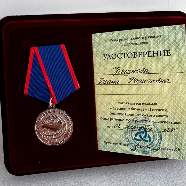 Диана Грешнова была удостоена медали «За успехи в бизнесе» за высокий профессионализм, добросовестный труд, успехи в развитии и продвижении конкурентоспособных услуг, освоение современных технологий и повышение эффективности производства.