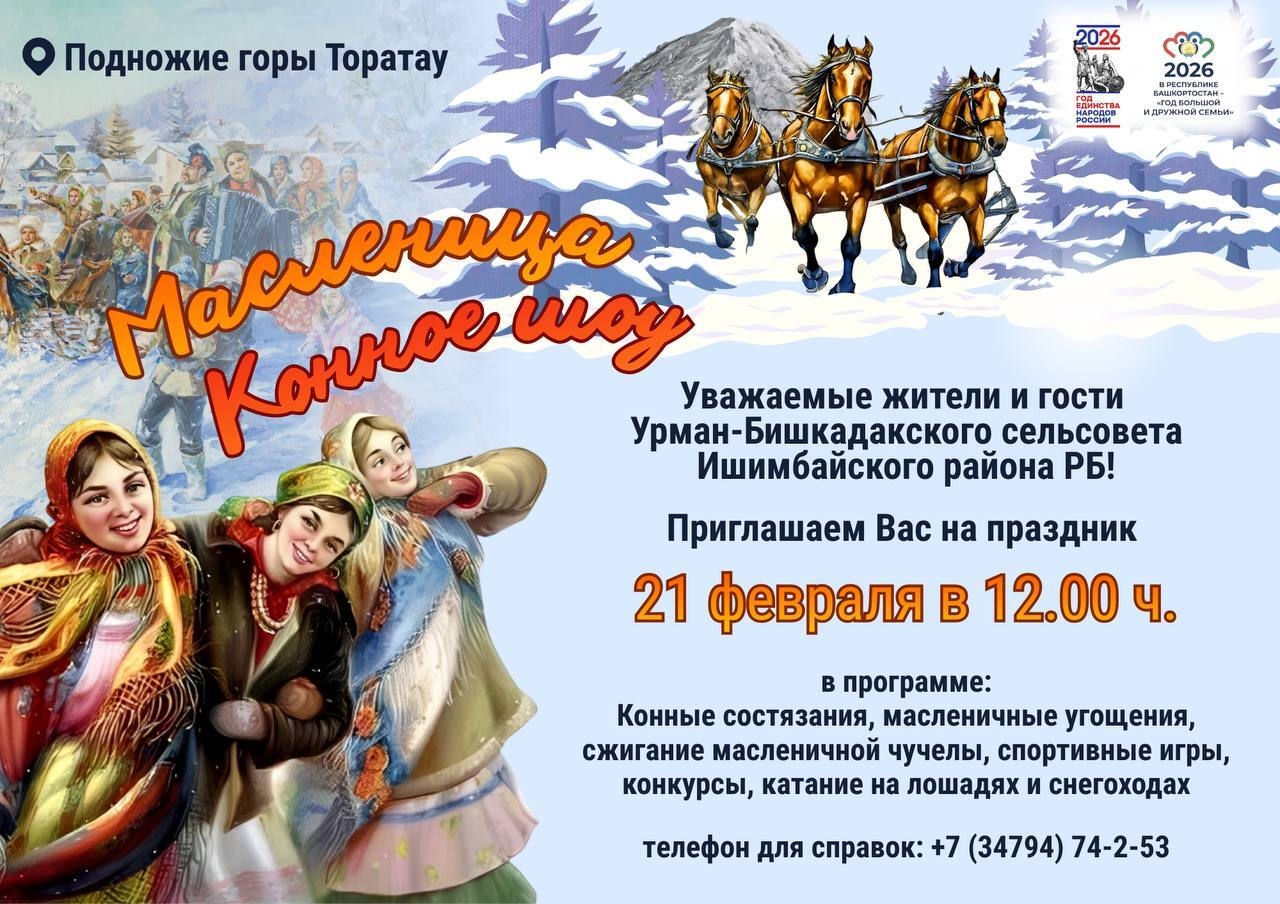 У подножия Торатау на территории Ишимбайского района Масленица пройдет 21 февраля. С 12 часов гостей будут ждать конные состязания, угощения, спортивные игры, конкурсы, катания на лошадях и снегоходах. В программу также включен традиционный обряд сжигания чучела.