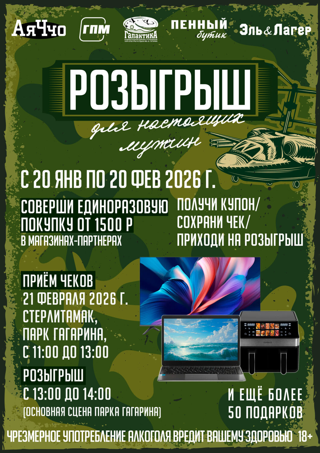 С 20- го января по 20-е февраля совершайте покупки от 1500 рублей в магазинах «АяЧчо», «Главпивмаркет», «ГПМ», «Пенный бутик» и «Эль&Лагер» и получайте купоны на участие в розыгрыше.