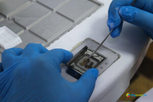 После охлаждения материал передают в другой кабинет, где кусочки нарезают на очень тонкие «слайсы» толщиной два микрона на специальном оборудовании. Эти тончайшие пластинки материала помещают уже на стекло. И далее мы возвращаемся в предыдущее помещение, где на отдельном оборудовании происходит процесс окрашивания препарата.