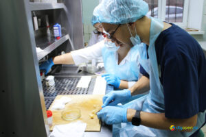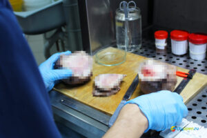 Во время вырезки в кабинете присутствуют четыре человека: санитар, врач и два лаборанта. В этот день в числе прочего вырезали частички матки, пораженной опухолью, а также фрагменты прямой кишки.