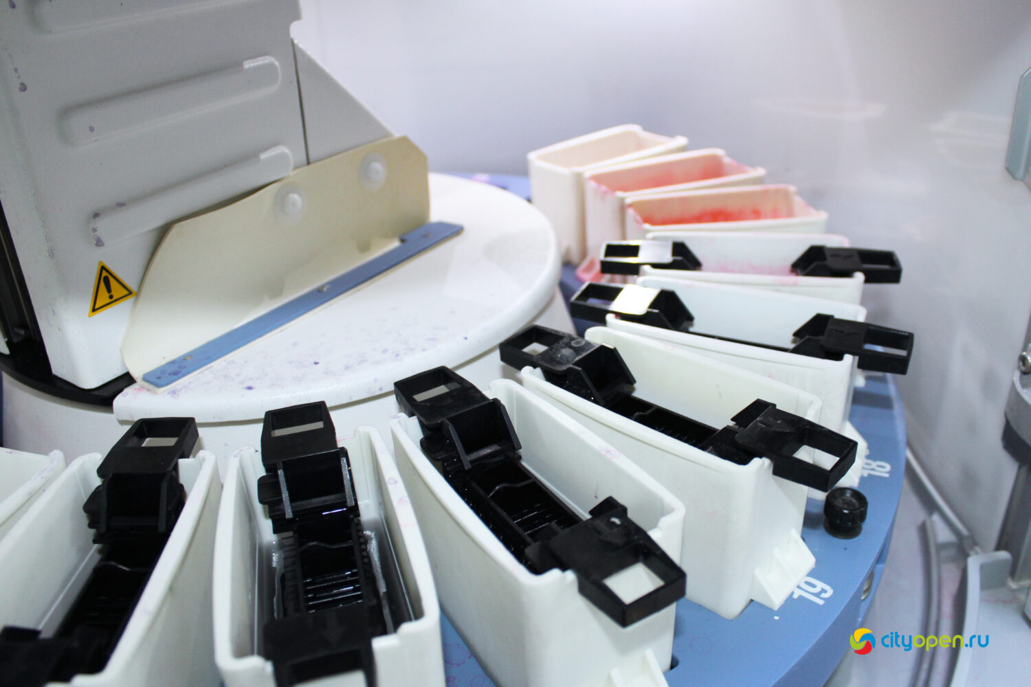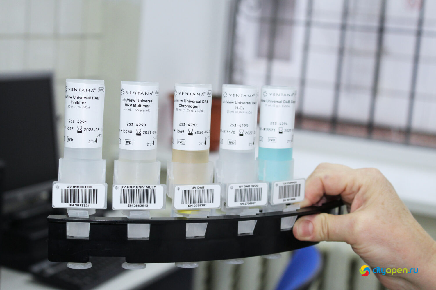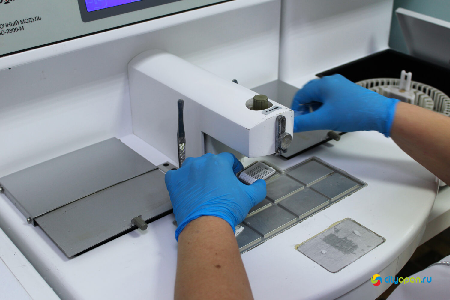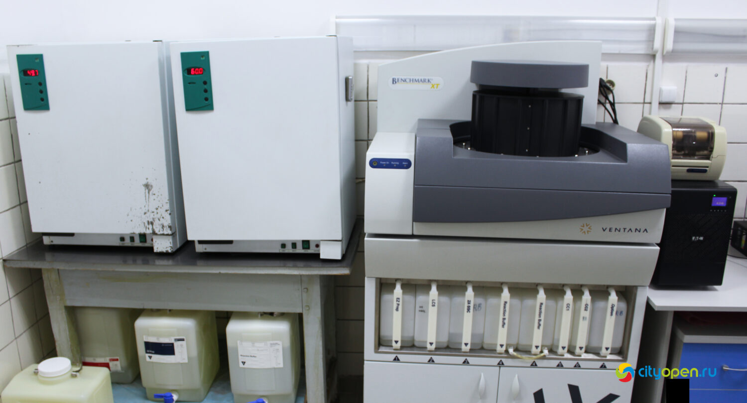 После охлаждения материал передают в другой кабинет, где кусочки нарезают на очень тонкие «слайсы» толщиной два микрона на специальном оборудовании. Эти тончайшие пластинки материала помещают уже на стекло. И далее мы возвращаемся в предыдущее помещение, где на отдельном оборудовании происходит процесс окрашивания препарата.