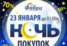ТЦ ФАБРИ напоминает, что в ночь с 23 на 24 января 2015 года состоится Акция «Ночь покупок»! Скидки до 70%.