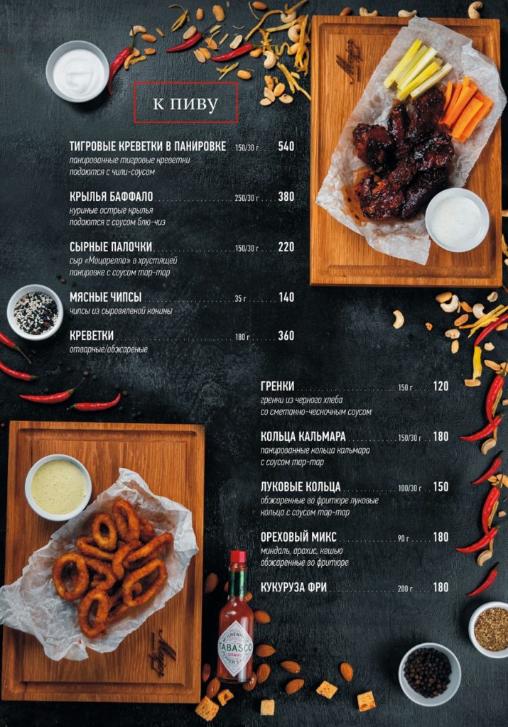 Любителям посидеть за кружкой «пенного», советуем обратить внимание на обновлённое предложение «К ПИВУ». Для гурманов, советуем обязательно попробовать наш ростбиф собственного приготовления с кисло-сладким соусом, или лосось обжаренный в маке. И вам обязательно должен понравиться домашний паштет и хрустящие тапас.