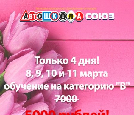ТОЛЬКО ЧЕТЫРЕ ДНЯ! Акция от автошколы «Союз» в честь праздника 🌸 МЕЖДУНАРОДНОГО ЖЕНСКОГО ДНЯ🌷 8 марта🌸8, 9, 10 и 11 марта 2018 года обучение на...