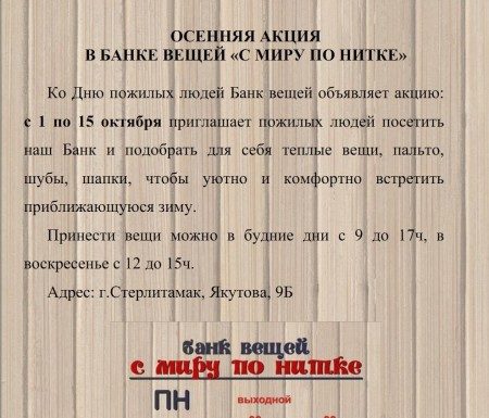 Ко Дню пожилых людей Банк вещей объявляет акцию: с 1 по 15 октября приглашает пожилых людей посетить наш Банк и подобрать для себя теплые...