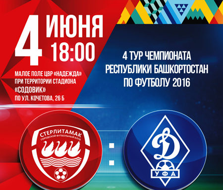 4 июня пройдёт очередная игра 4 тура Чемпионата РБ по футболу 2016 г., где наш Городской Футбольный клуб «Стерлитамак» встретится с ФШМ «Динамо» г....
