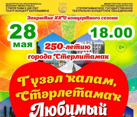 Дорогие друзья! 28 мая в 18.00 часов на площади СГТКО состоится большой концерт “Любимый город на Стерле”, посвященный 250-летию города Стерлитамак. В честь праздничного...