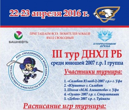 Хоккейный клуб «Орлан» приглашает гостей и жителей города Стерлитамак посетить матчи III тура Чемпионата ДНХЛ РБ среди юношей 2007 г.р.