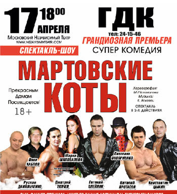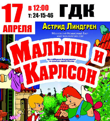 Спектакли "Малыш и Карлсон" и "Мартовские коты", намеченные на 17 апреля в ГДК, не состоятся, так как Московский независимый Театр отменил гастрольный тур по...