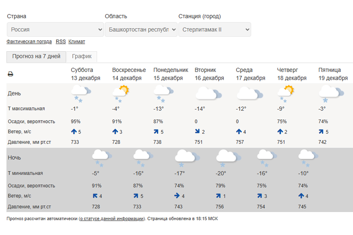 По данным Гидрометцентра России, в Стерлитамаке 14 декабря в дневное время прогнозируется -4 градуса, днем и ночью ожидается снег. В понедельник, 15 декабря, температура воздуха резко пойдет вниз – до -13 градусов. Снег продолжится.