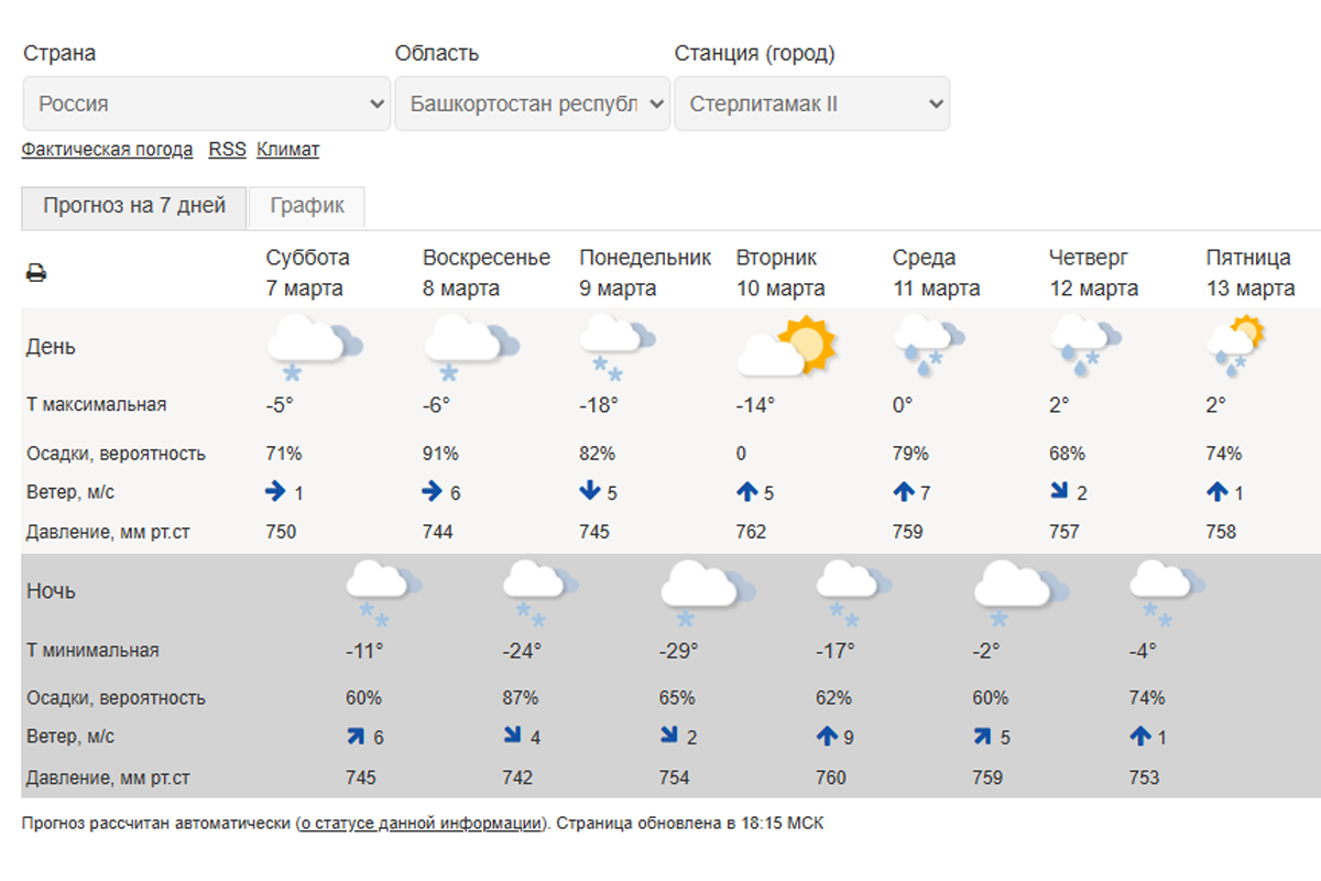 По данным синоптиков, в Стерлитамаке 8 марта в дневное время температура воздуха составит -6 градусов, а вот ночью – уже около -24 градусов. Девятого числа днем ожидается -18 градусов, в ночь на вторник подморозит до -29 градусов. В течение трех дней будет идти снег различной интенсивности и длительности.