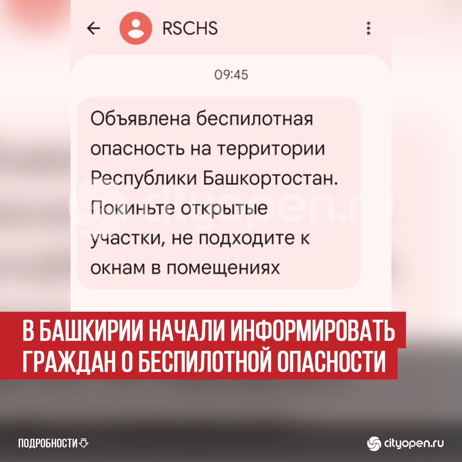 В смс, рассылаемом гражданам, говорилось, что необходимо покинуть открытые участки и не подходить к окнам в помещениях. Информация о беспилотной опасности на территории республики также появилась на сайте Госкомитета РБ по ЧС.