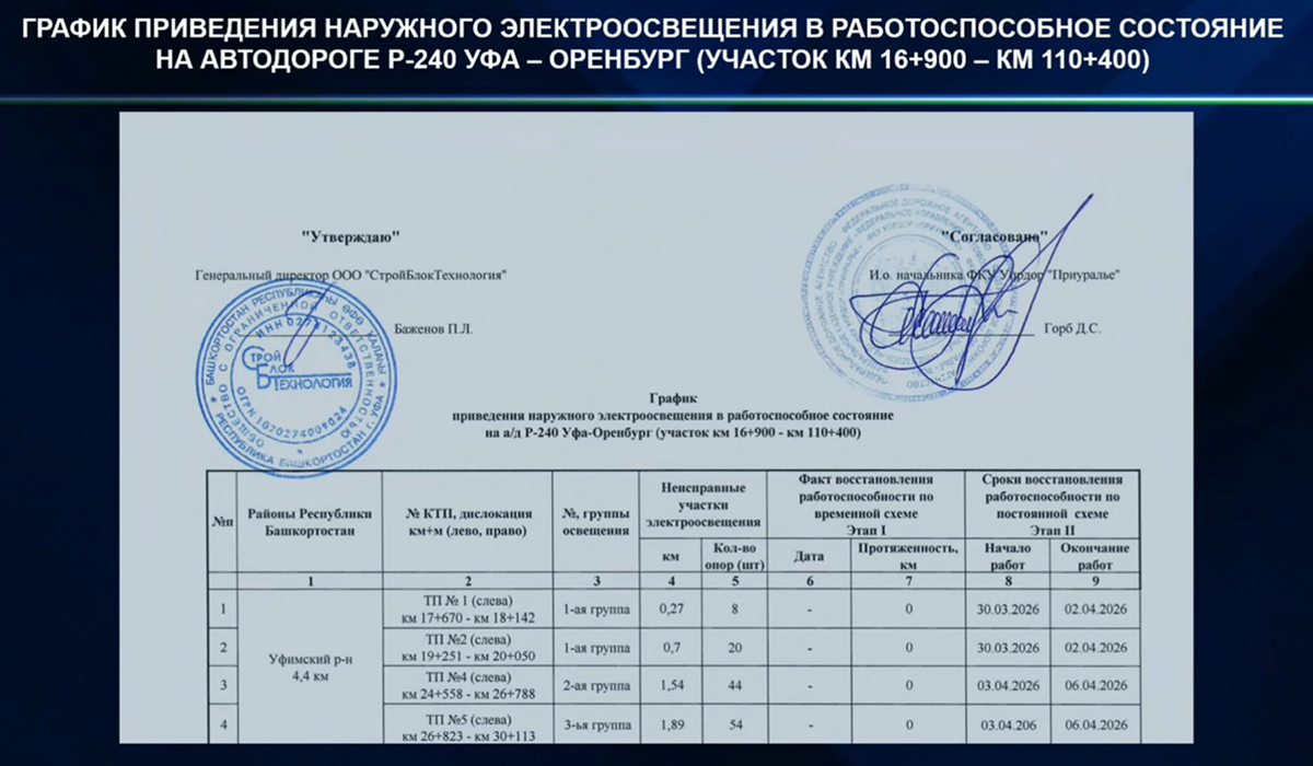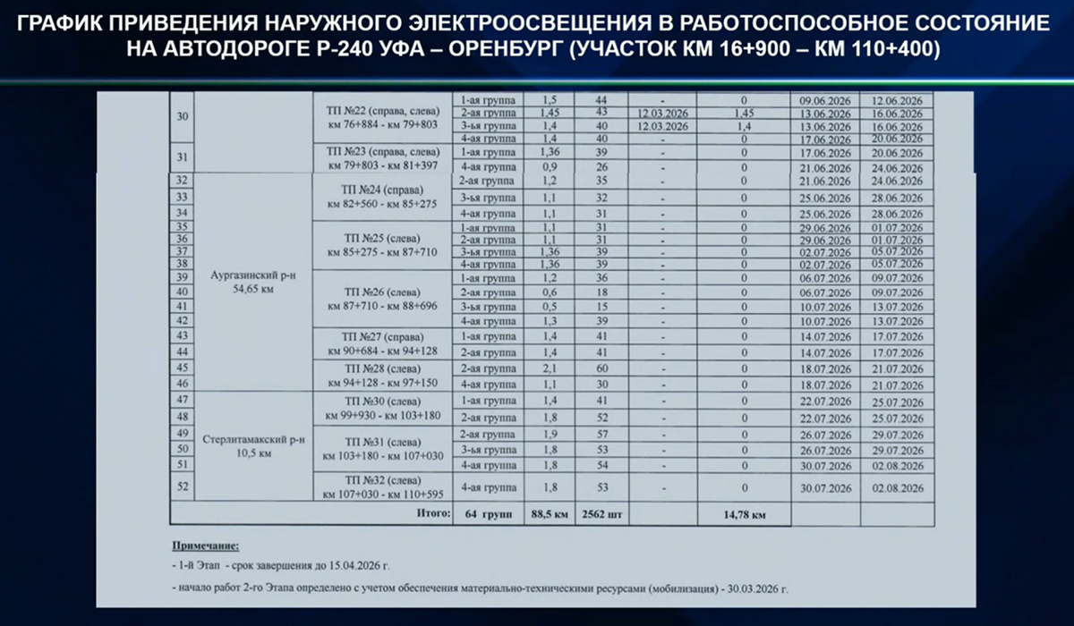 По его словам, работы по восстановлению освещения будут проводиться в два этапа. В ходе первого этапа будет восстановлено освещение по временной схеме. Ожидается, что до 15 апреля 2026 года эту работу завершат, то есть до указанной даты все наружное освещение на трассе должно будет функционировать. Второй этап стартует с 30 марта.