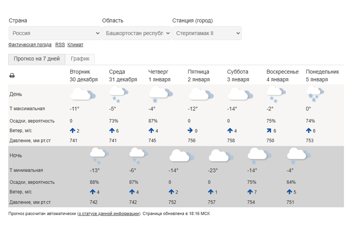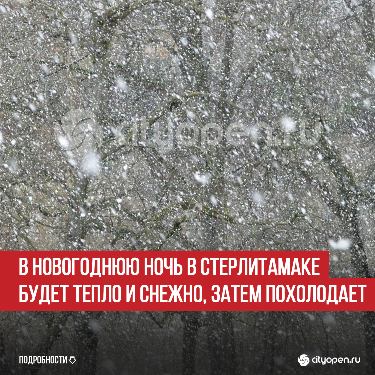 По данным Гидрометцентра России, в Стерлитамаке днем 31 декабря ожидается -5 градусов. В новогоднюю ночь похолодает только до -6 градусов. Днем 1 января прогнозируют -4 градуса. Все это время будет идти снег, возможно, с перерывами.