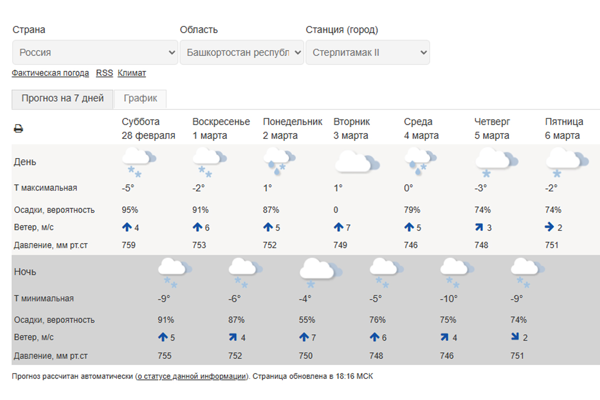 По данным Гидрометцентра России, в Стерлитамаке 1 марта днем ожидается -2 градуса. Ночью и днем будет идти снег. На следующий день температура повысится до +1 градуса, прогнозируют снег с дождем. Во вторник, 3 марта, дневная плюсовая температура воздуха сохранится.
