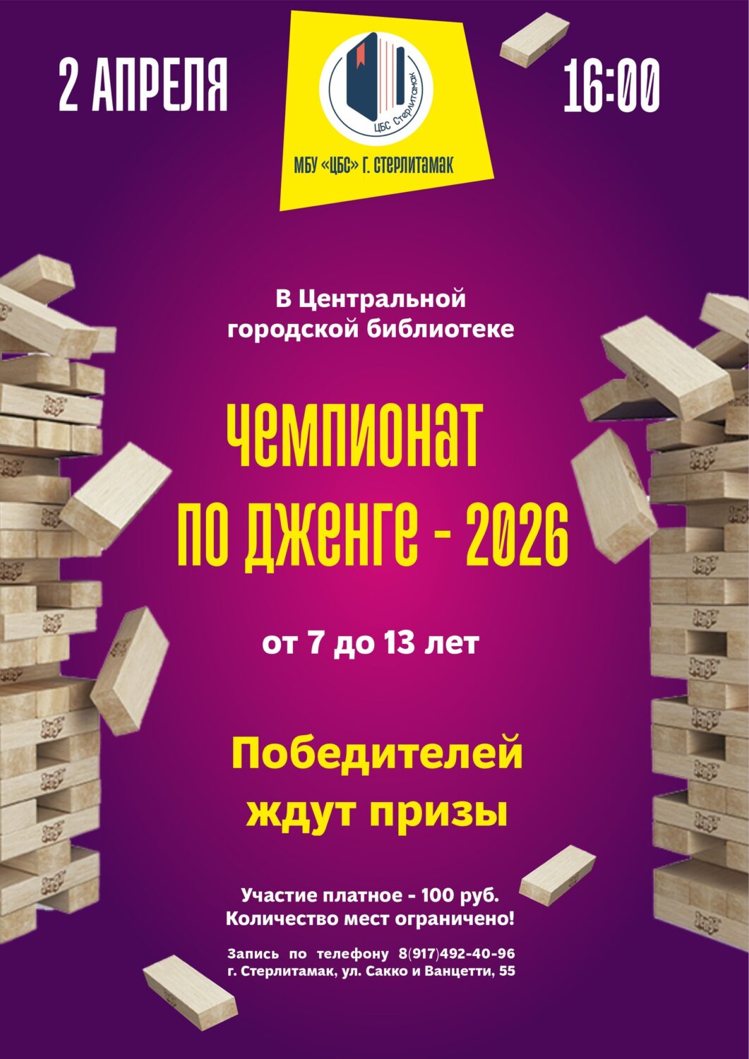 В Стерлитамаке 2 апреля с 16 часов на базе Центральной городской библиотеки (ул. Сакко и Ванцетти, 55) пройдет Чемпионат по «Дженге». Эта игра также известна как «Башня».