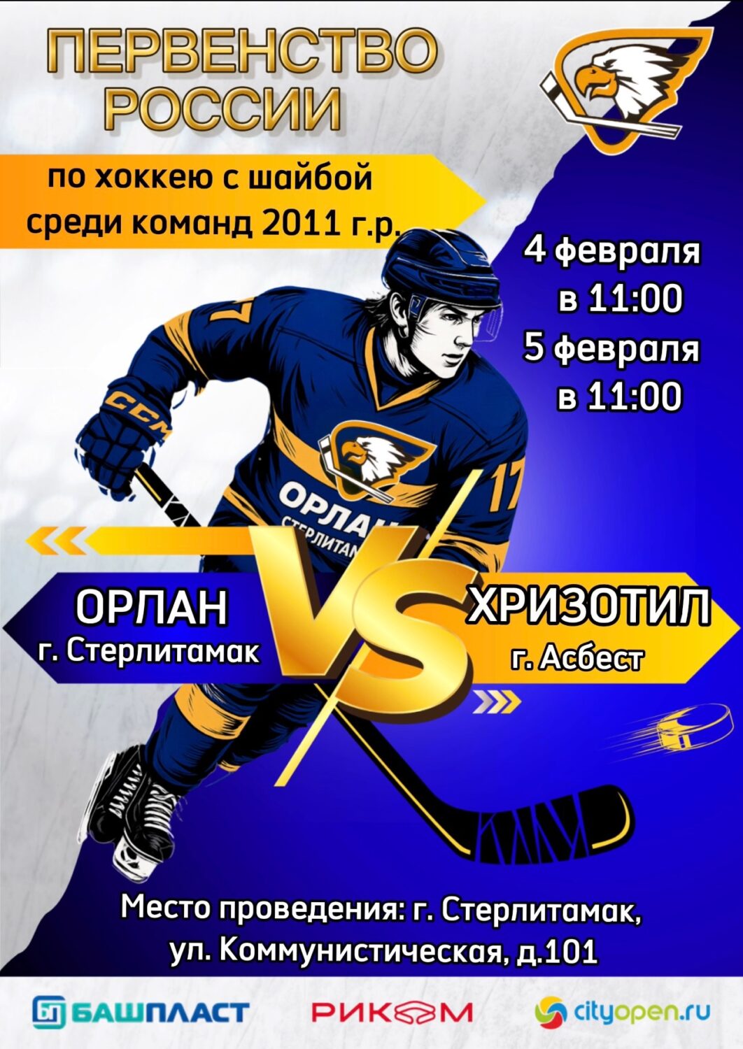 По сообщению спортивной школы №3, на льду встретятся ХК «Орлан 2011» (Стерлитамак) и ХК «Хризотил» (Асбест, Свердловская область).