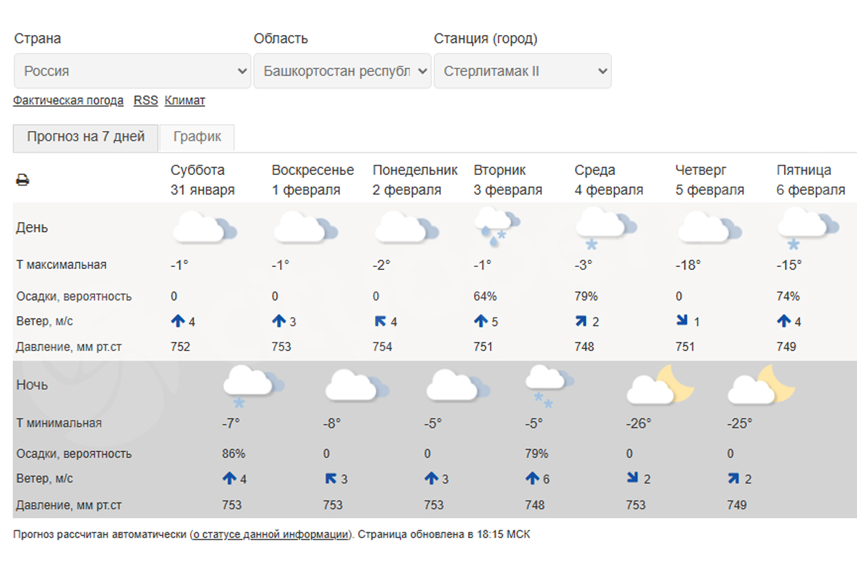По данным Гидрометцентра России, в Стерлитамаке 1 февраля температура воздуха днем составит всего лишь около -1 градуса. В ночь на 2 февраля ожидается -8 градусов. В последующие три дня дневная температура воздуха не опустится ниже -3 градусов. Во вторник и среду возможны осадки в виде снега.