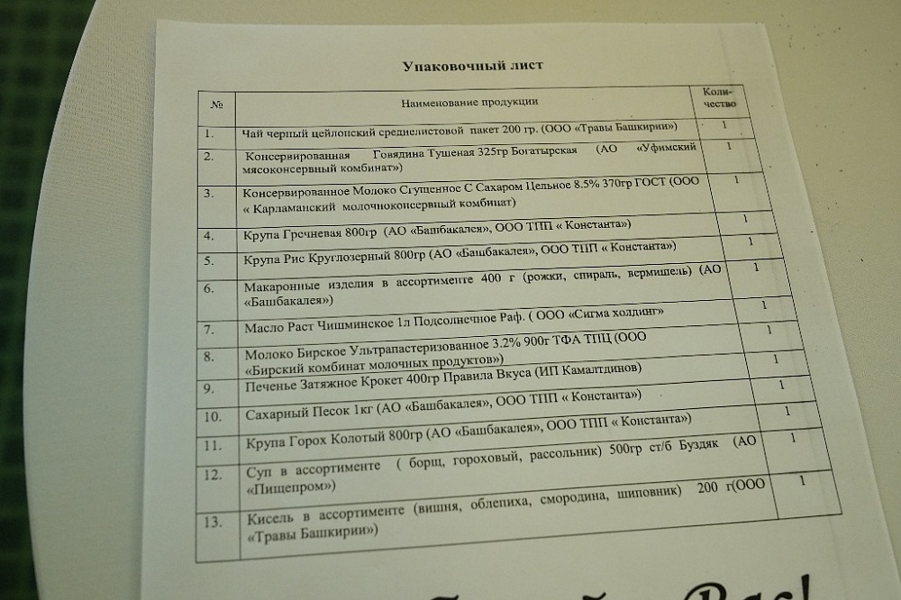 Цена проднабора составляет 700 рублей. Обозначенной категории граждан такие наборы выдадут бесплатно. Состоят коробки на 80% из продуктов, произведенных в Башкирии.