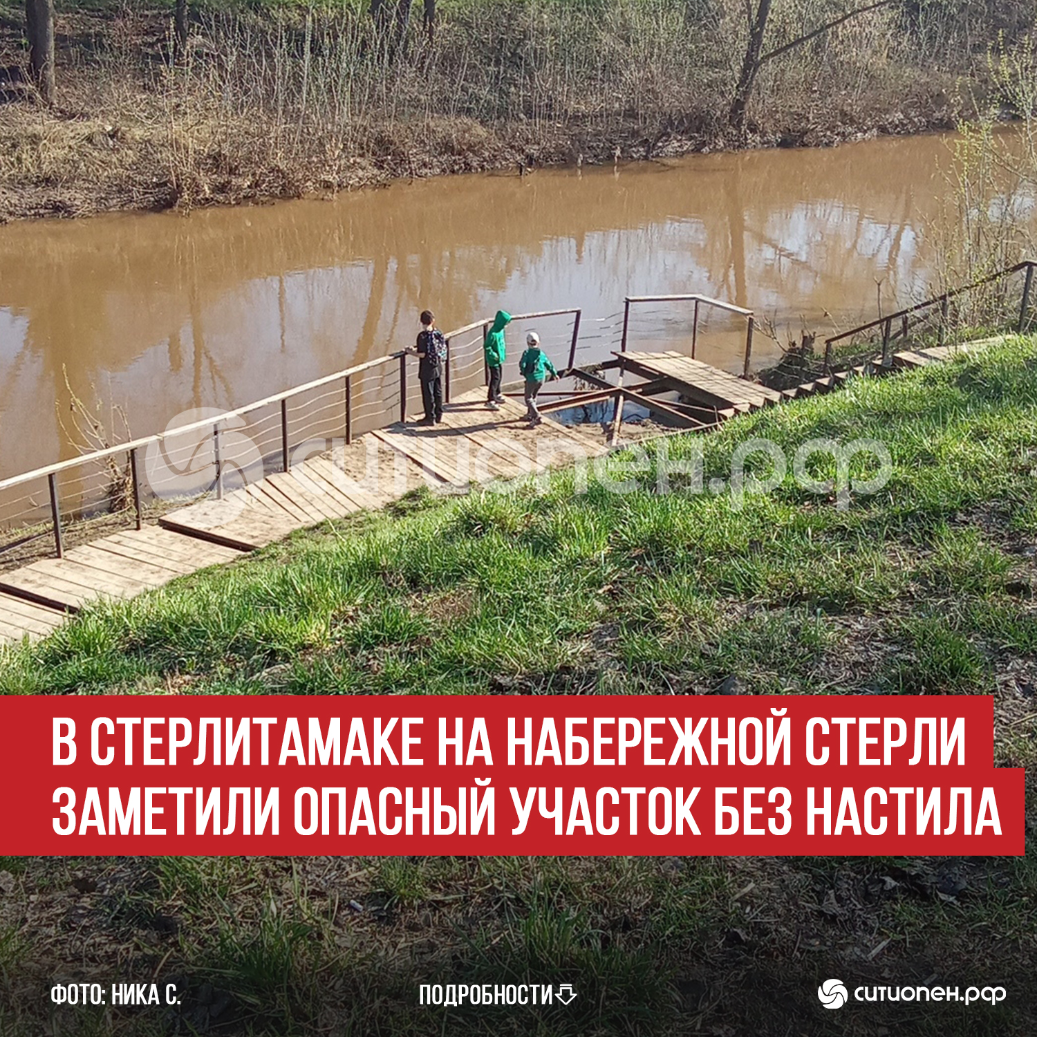 Жительница Стерлитамака обратилась в ЦУР Башкирии, представив фотографию одного из участков набережной Стерли, на котором частично отсутствует настил. Досок не хватает прямо над обрывом. При этом на фото рядом с этим участком ходят дети.