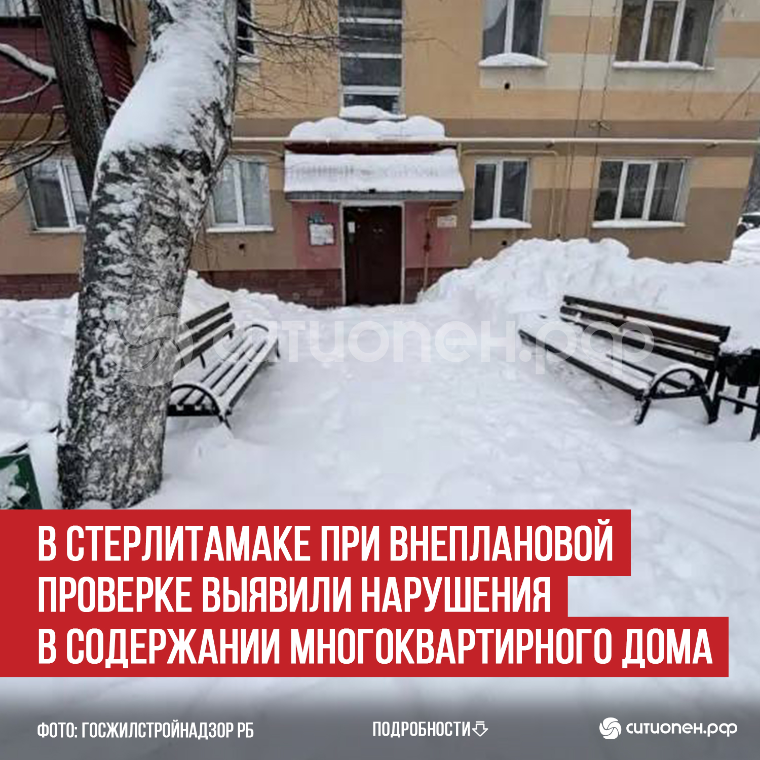 По информации ГК РБ по жилищному и строительному надзору, на придомовой территории указанного дома отмечен неубранный снег, в третьем подъезде на первом этаже не срабатывал датчик движения, то есть освещение не включалось автоматически. Также в местах общего пользования не обнаружились графики уборки. При этом, отметили в Госкомитете, в подъездах было чисто, следов плесени не обнаружили.