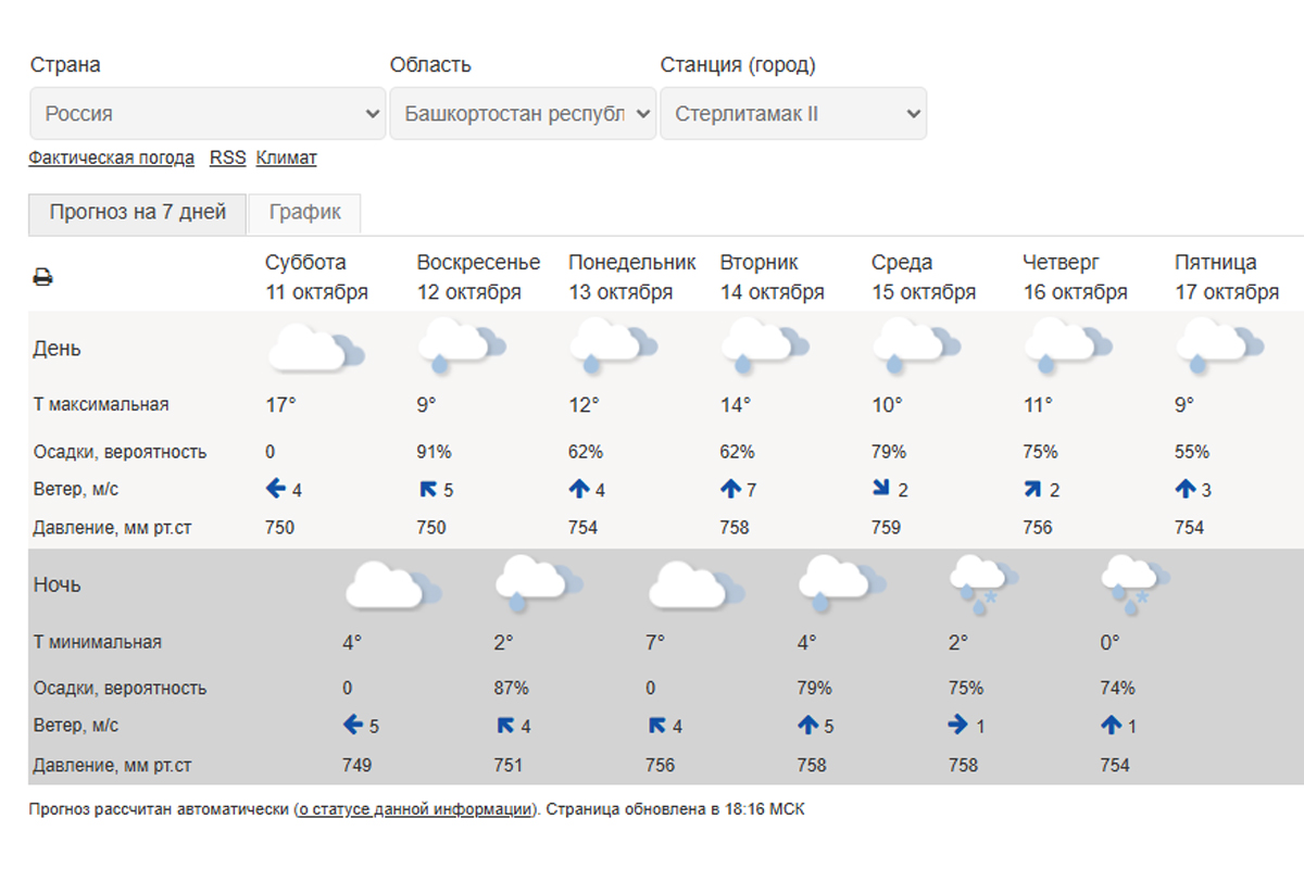 По данным Гидрометцентра России, в Стерлитамаке 12 октября дневная температура воздуха составит +9 градусов. Возможен небольшой дождь. В ночь на 13 октября температура опустится до +2 градусов.
