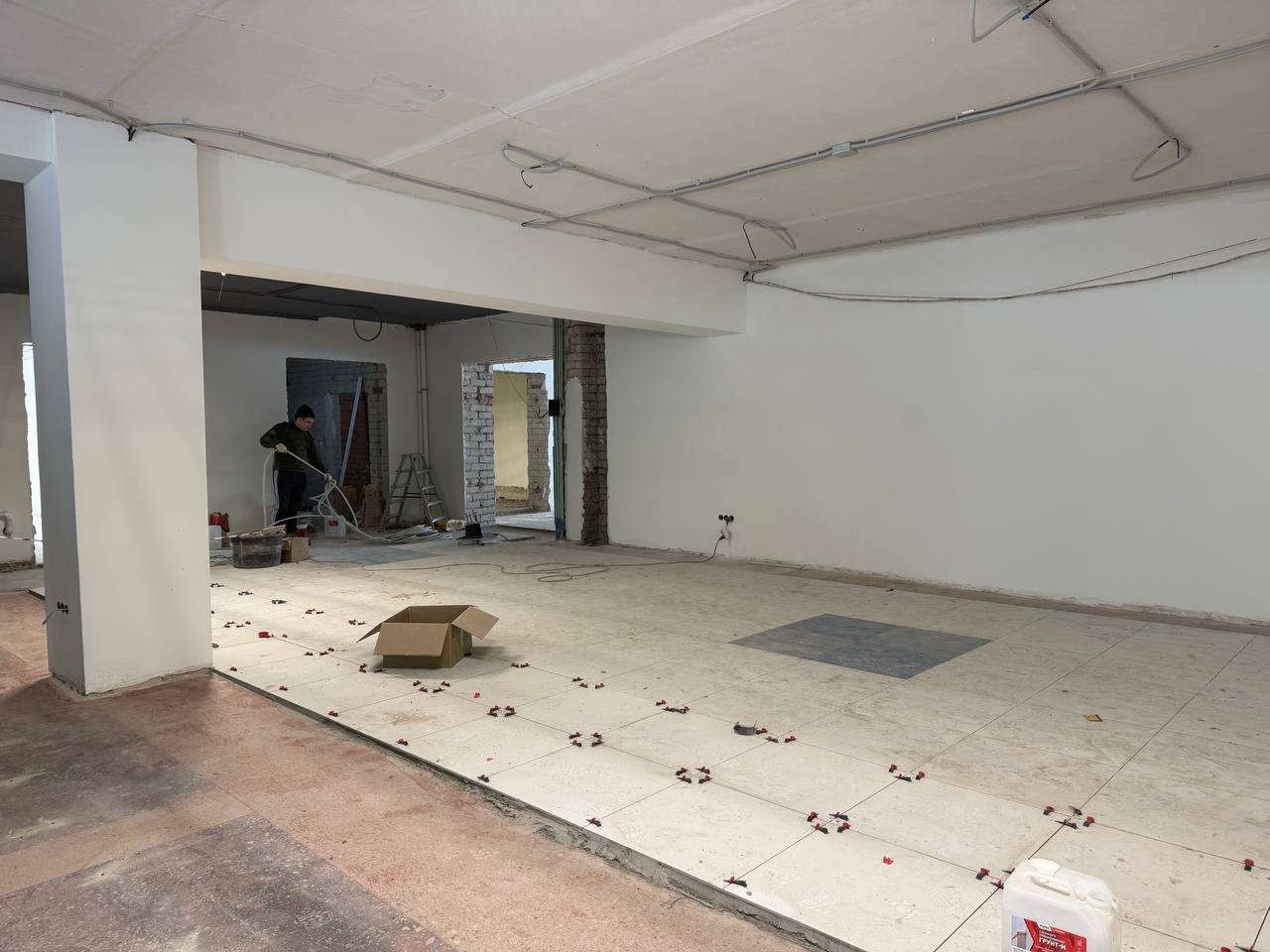 Отделочные работы выполнены на 70%, стяжку потолка завершили наполовину, монтаж потолков – на 20%, укладку керамогранита – на 10%.