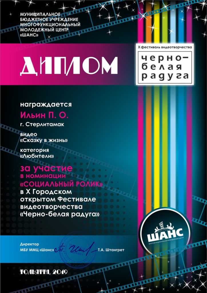 Кстати говоря, короткометражка уже получила награду. Павел Ильин был награжден дипломом Х фестиваля видеотворчества «Черно-белая радуга» (Тольятти) за участие в номинации «Социальный ролик» в категории «Любитель».