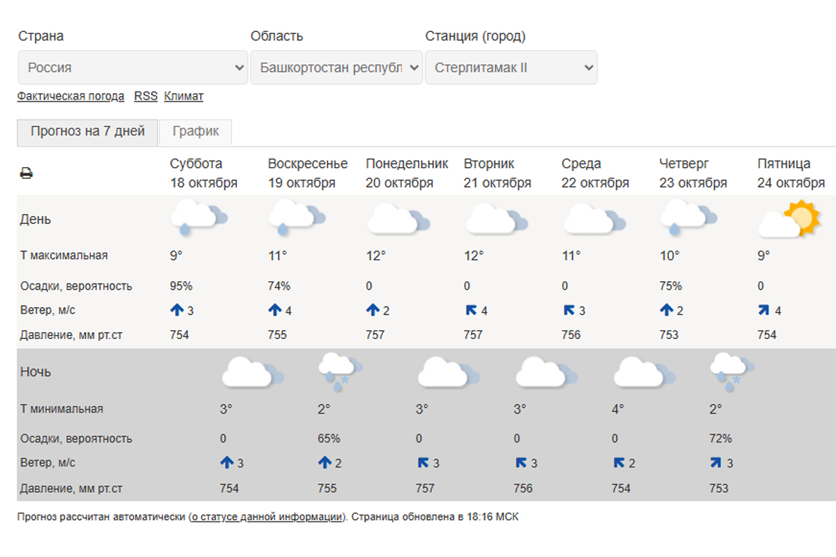 По данным Гидрометцентра России, в Стерлитамаке 19 октября температура воздуха днем составит +11 градусов. Прогнозируется небольшой дождь. В ночь на 20 октября похолодает до +2 градусов, временами пройдут небольшие осадки.