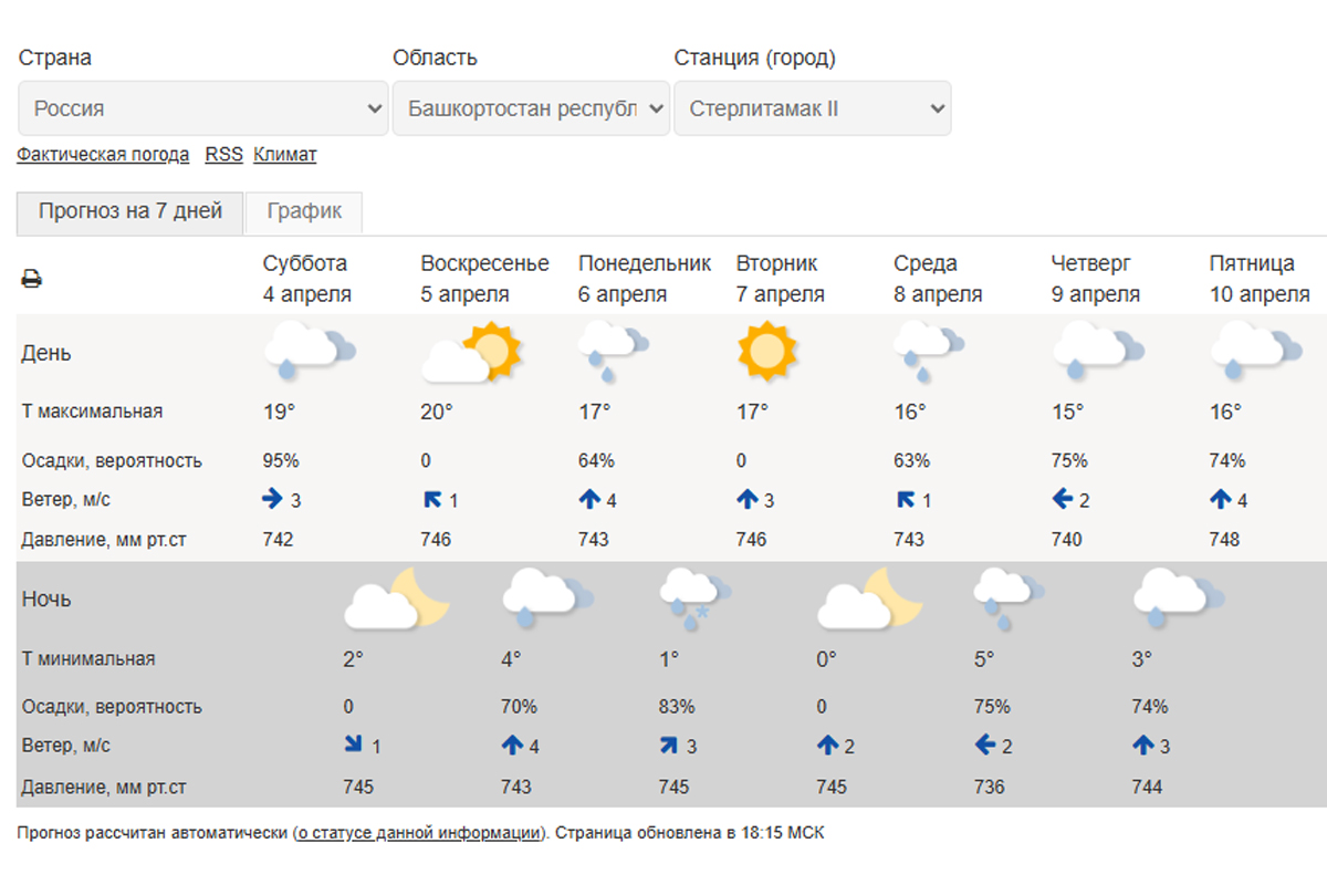 В Стерлитамаке в ближайшие дни ожидается достаточно теплая погода, но только в дневное время. Ночью же температура воздуха может опуститься даже до нулевой отметки. Также прогнозируют дожди.