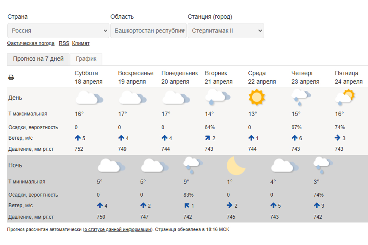 В ближайшие дни ожидать жаркой погоды не стоит. По прогнозам синоптиков, в Стерлитамаке сохранится весенняя прохлада, которую периодически будут сопровождать дожди.
