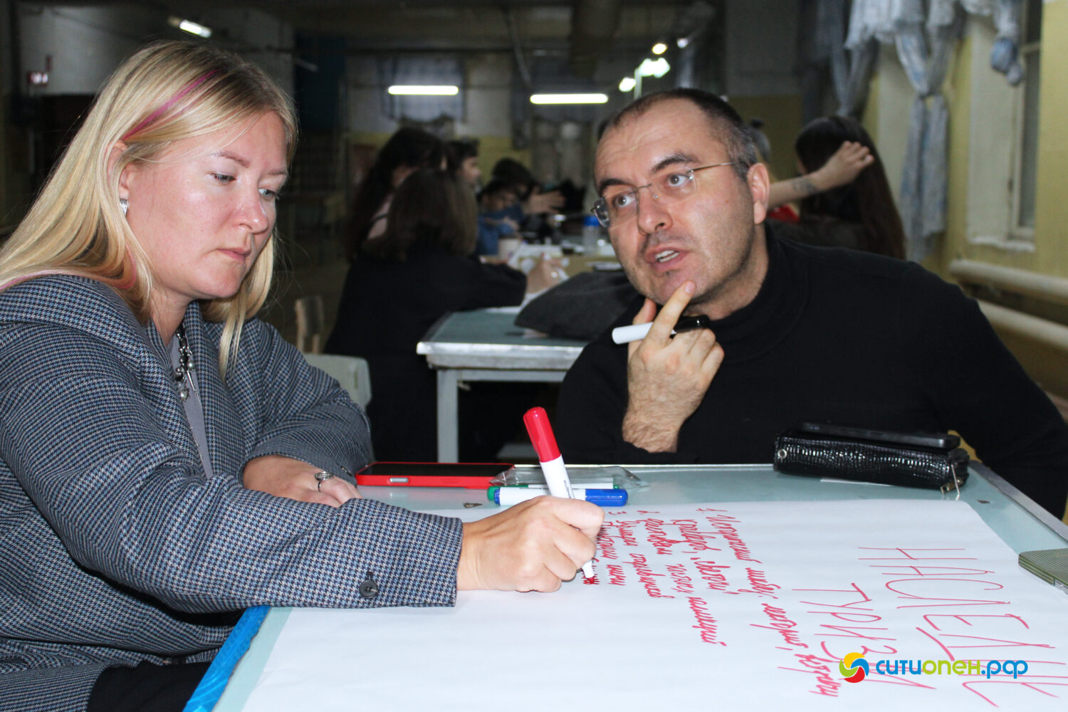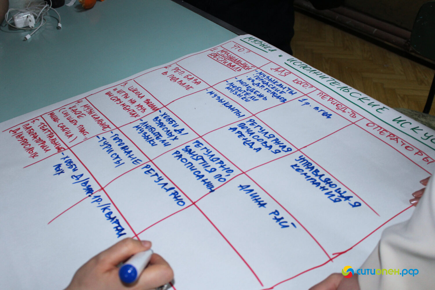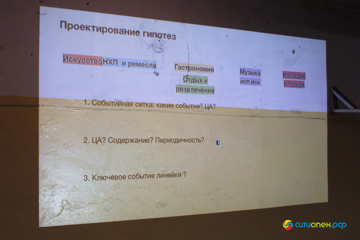 Участники встречи поделились своими предложениями. Например, одна из групп обозначила необходимость проведения музыкальных фестивалей, организацию театральной лаборатории и др. Группа, которая занималась гастрономическим блоком, выдвинула идею проведения аналога «Битвы шефов», организации игровой, а также размещения настоечной, лимонадной.
