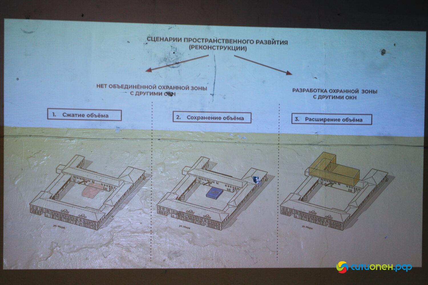 Также было представлено три сценария пространственного развития (реконструкции). Первый сценарий предполагает сжатие объема путем «удаления» того небольшого строения, которое расположено во дворе фабрики. Отметим, что это строение разрушается, сейчас внутрь даже не разрешают зайти, так как это небезопасно.