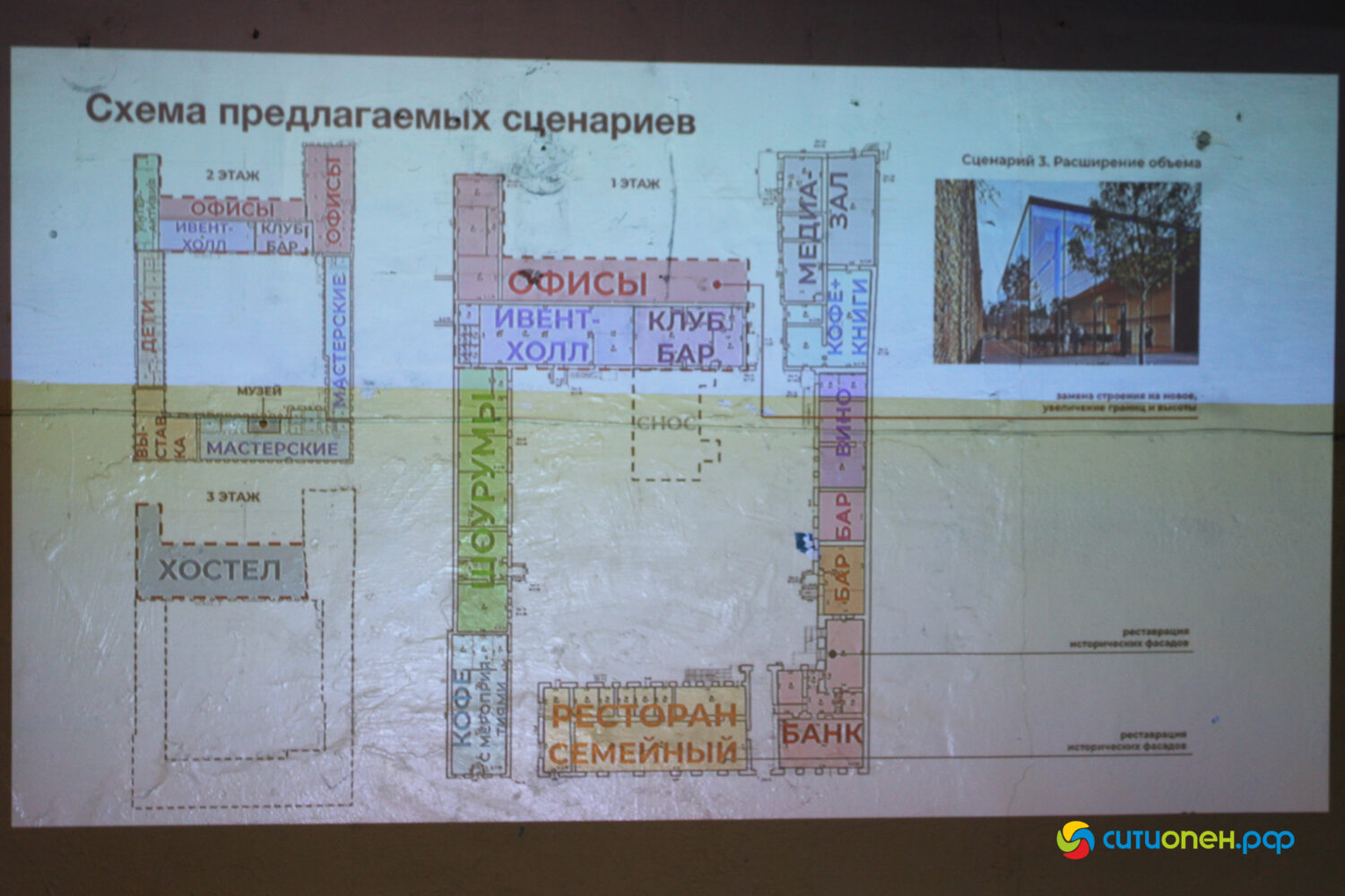 Третий сценарий – расширение объема. В этом случае к существующему зданию могут быть добавлен, например, еще один этаж, но только в той части здания, которая не является исторической, а была так же пристроена в советские годы.