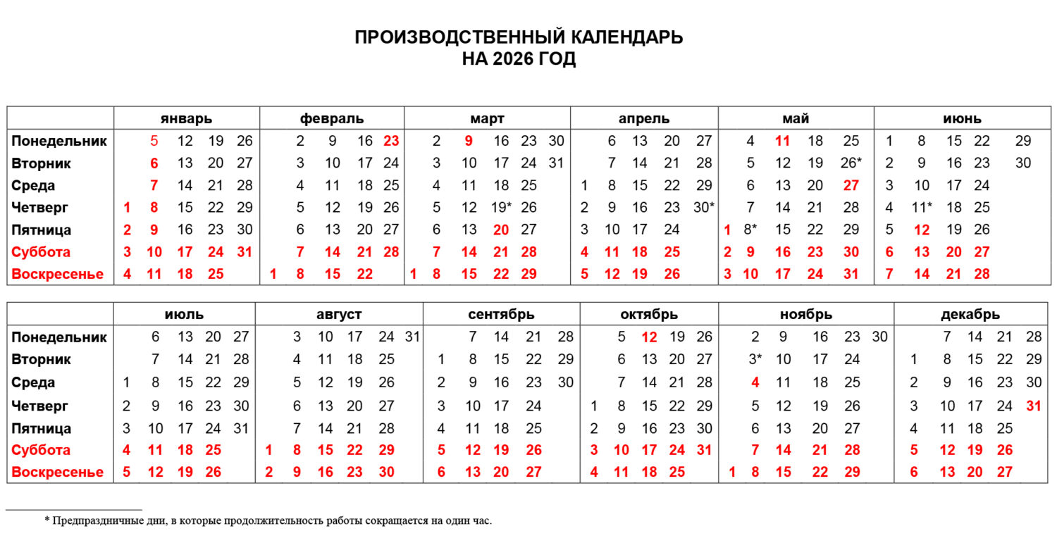 В 2026 году в Башкирии при пятидневной рабочей неделе ожидается 244 рабочих дня, из них 6 дней будут сокращены на один час, и 121 выходной день. Об этом сообщает Министерство семьи, труда и соцзащиты населения РБ.