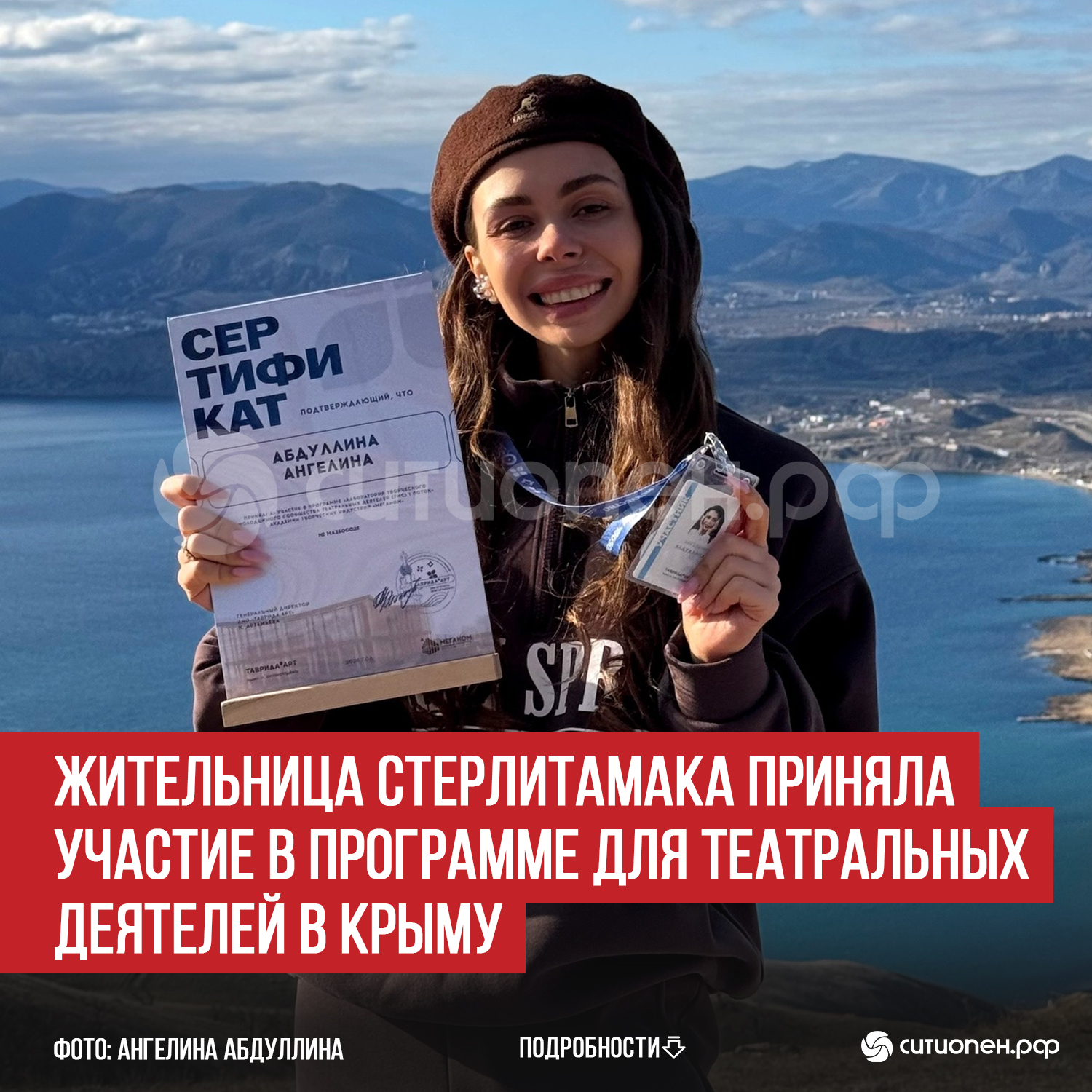 Жительница Стерлитамака, основатель и руководитель студии актерского мастерства «ДОМиРОЛЬ» Ангелина Абдуллина стала единственной представительницей Башкирии, принявшей участие в программе «Лаборатории Творческого молодежного сообщества театральных деятелей», объединившей молодых специалистов театральной сферы со всей России.
